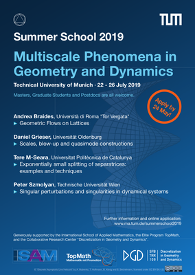 The summer school Multiscale Phenomena in Geometry and Dynamics at the Department of Mathematics of the Technical University Munich is aimed at Master's students, PhD students and postdocs whose interests are related to the topics of multiscale methods for ordinary and/or partial differential equations. It covers a broad spectrum of topics of current interest in the area.