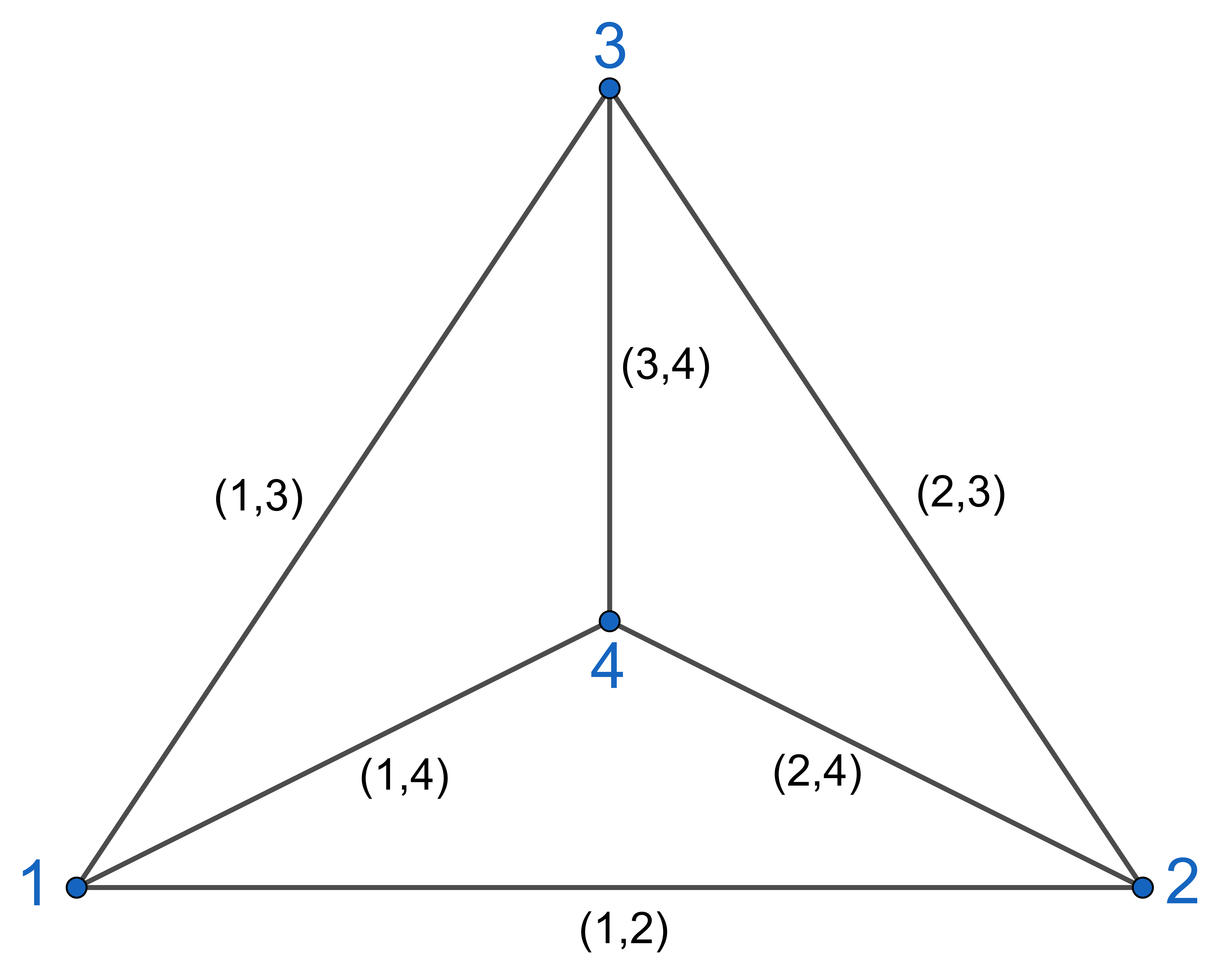 [(1, 2), (1, 4), (2, 3), (2, 4), (3, 4)]
