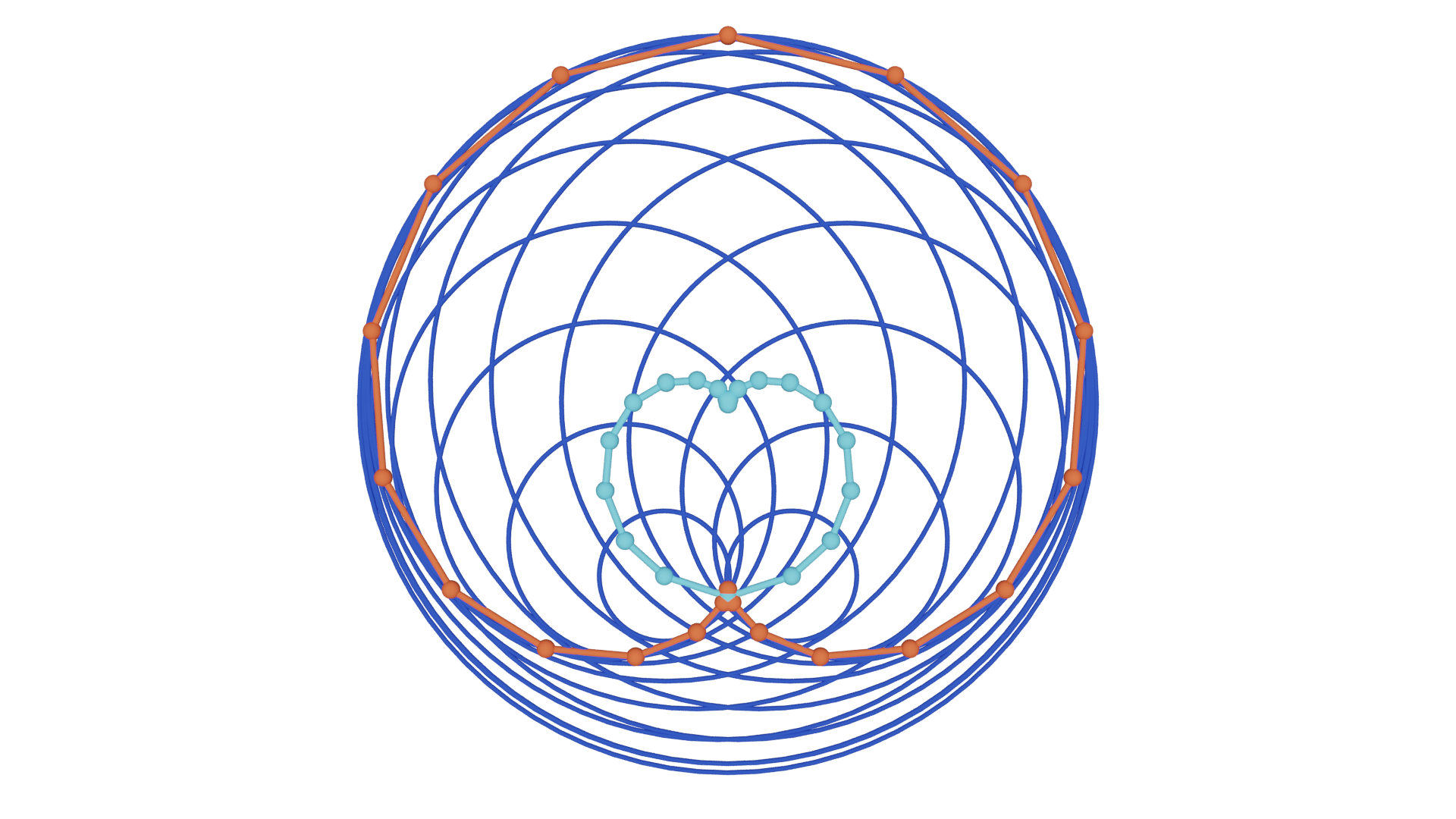 This example is about curvature circles of a (discrete) plane curve. It illustrates the relationship between the curvature circles of the plane curve and the ones of its counterpart on the Möbius sphere, obtained by inverse-stereographic projection of the planar points.