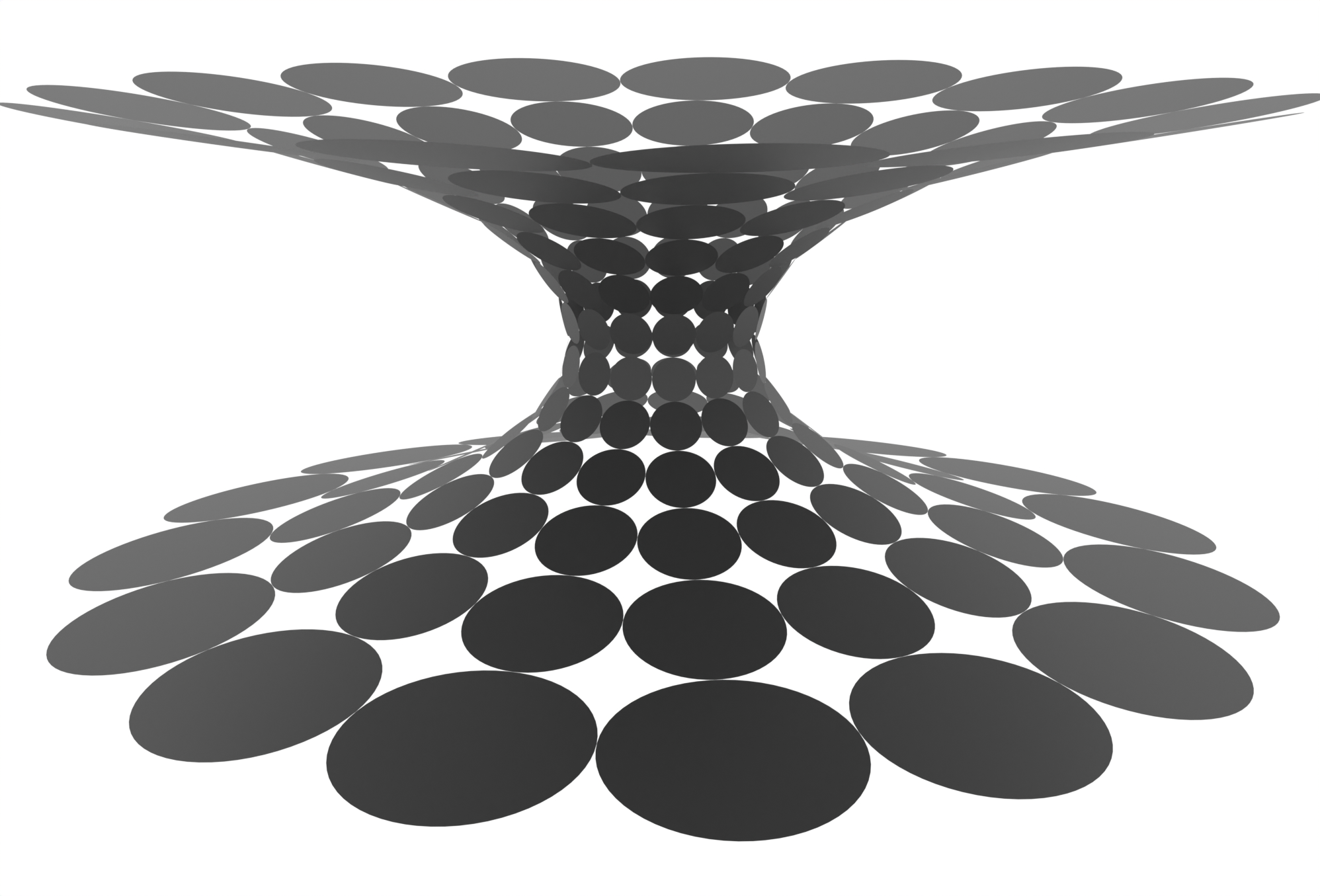 We will use the S-Exp circle pattern, shown below, from this example as discrete Weierstrass data. We could use the explicit Weierstrass representation formula, but instead we will project the S-Exp circle pattern to a Koebe net tangential to the unit sphere, and Christoffel dualize it to obtain a discrete S-isothermic surface. For the S-Exp circle pattern the resulting S-isothermic surface will be a discrete catenoid.