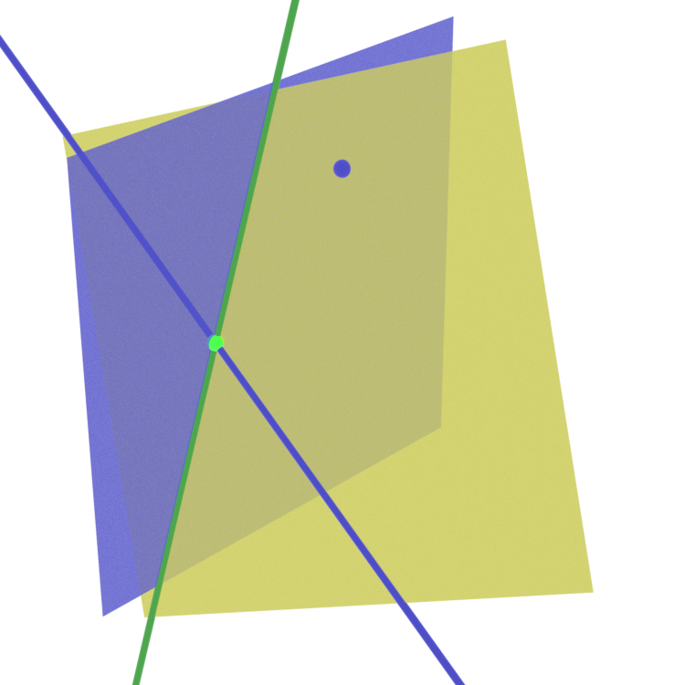 We can see all of these subspaces in the image below. The explicitly created objects are shown in blue, the join of the line and the point in yellow. The intersection of the plane and the line is shown in light green and the intersection of the plane and the join in dark green.