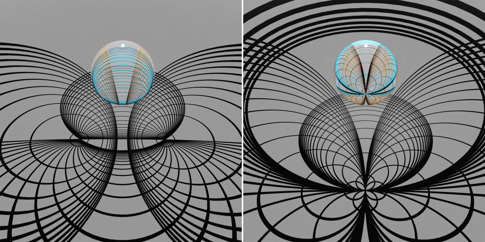 If we now consider a line in \(\mathbb{R}^3\), by polarity its points define a one-parameter family of planes in \(\mathbb{R}^3\) and therefore a one-parameter family of spherical circles, and hence - via stereographic projection - a so called Möbius pencil of circles in \(\widehat{\mathbb{R}^2}\).